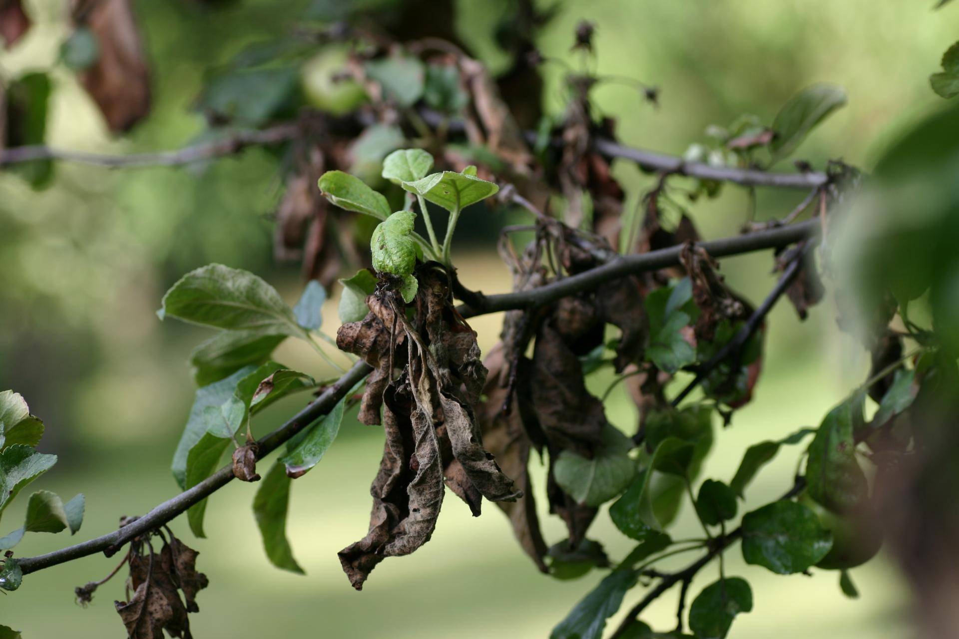 Наибольшая активность бактериального ожога наблюдается в начале лета, с конца июня по июль. Пятна на листьях быстро распространяются, и дерево с серьезными повреждениями выглядит так, словно его обожгли. Именно поэтому это заболевание получило название «ожог». Для его лечения применяются антибиотики.