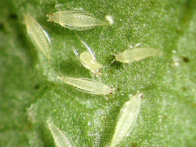 - Белокрылка – маленькая белая бабочка. Она проникает в верхний слой тканей орхидеи и высасывает сок. После ее активности остаются прозрачные капли нектара и желтоватые разводы. Многие цветоводы используют липкие ленты для мух, чтобы спасти орхидеи, но если не успеть, белокрылка откладывает яйца, и борьба с ней становится сложнее. Против белокрылки эффективен любой инсектицид. После обработки растение следует накрыть пленкой, чтобы уничтожить не только взрослых особей, но и личинок.