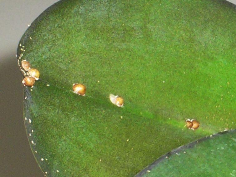 - Щитовка. Этот вредитель размножается очень быстро, самки прячут свои яйца под панцирем. Вылупившиеся личинки могут передвигаться и расползаются по побегам, ища место для прикрепления хоботком, где они остаются до достижения взрослого состояния и кладки яиц. Щитовка питается сладким соком фаленопсиса. Полив почвы в горшке кишечно-контактным инсектицидом заставит щитовку высасывать отравленный сок, что приведет к ее гибели.
