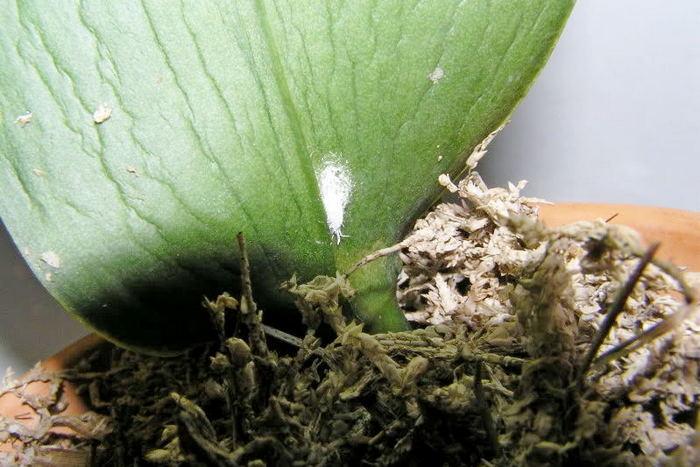 - Мучнистый червец. Этот вредитель может быть легко перепутан со щитовкой. Он может обитать не только на растении, но и в почве рядом с ним. Личинки и взрослые особи проникают в листья и стебли, высасывая сок. После их появления на растении остаются липкие следы. В сосуды растений попадают токсичные ферменты, выделяемые червецом, что ослабляет растение и может привести к его гибели.