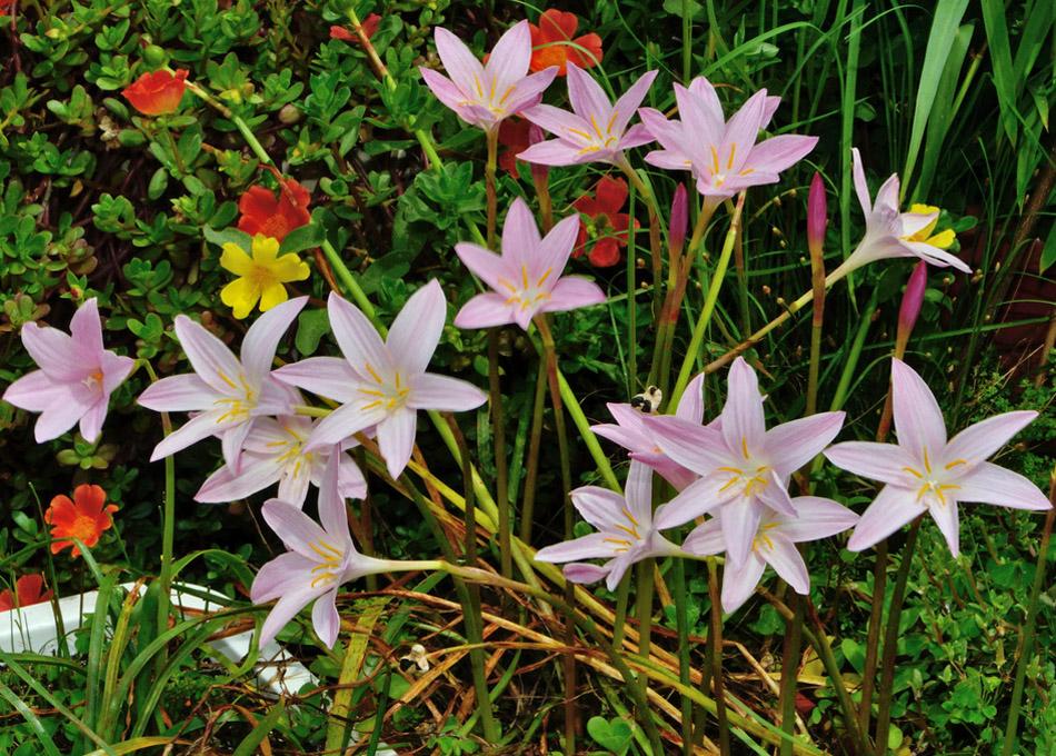 Зефирантес быстро разрастается, создавая ароматный ковер на клумбе. Используя различные виды этого растения, можно украсить цветник оригинальными узорами. Они также прекрасно смотрятся на подоконниках.