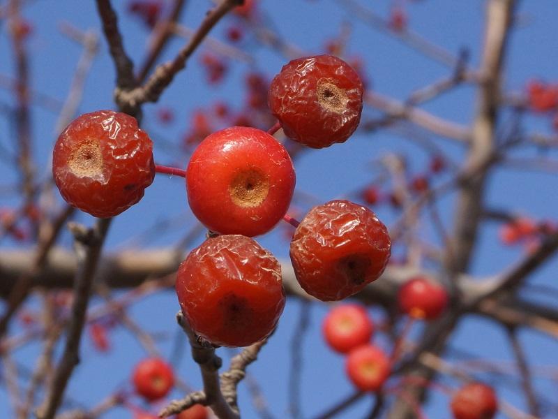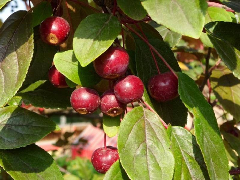 Техническая зрелость плодов достигается в сентябре. Маленькие красные яблоки украшают крону дерева до декабря. Их диаметр не превышает 1 см, а внутри плод разделен на 5 камер, содержащих семена.