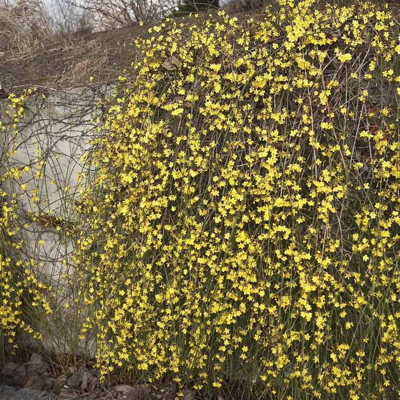 Это растение иногда именуют зимним жасмином благодаря его способности распускать цветы в конце февраля. В этот период тонкие поникающие ветви покрываются мелкими желтыми цветочками, что создает особенно эффектный контраст с темными хвойными деревьями или изгородями. Голоцветковый декоративный жасмин отличается неприхотливостью, хорошо переносит обрезку и не предъявляет высоких требований к составу почвы.
